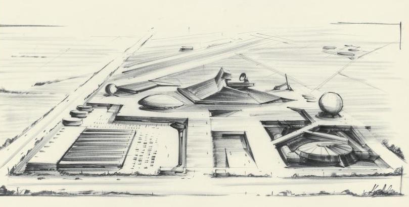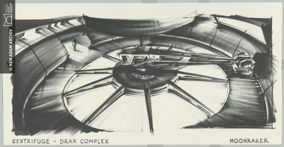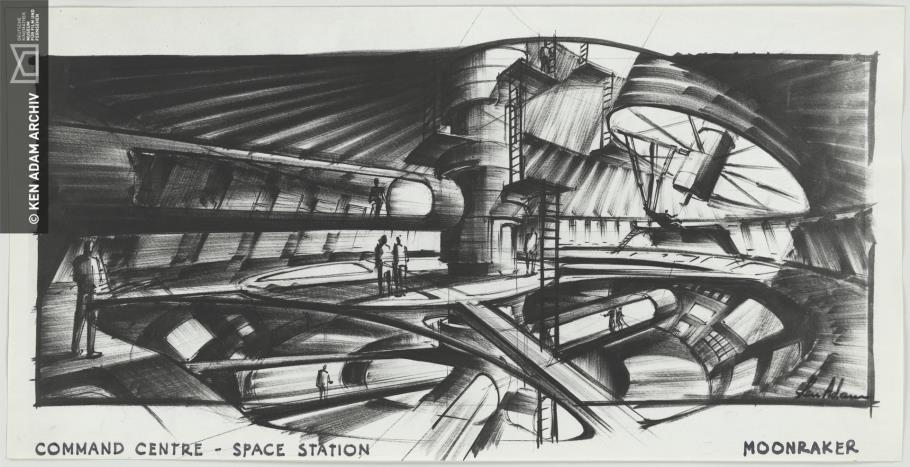 Ken Adam s’empare du look du centre pour le transformer en laboratoire et bureaux de développement de vaisseaux spatiaux. Sur son croquis, il ajoute une sculpture expressive en contrepoint d’éléments vitrés et brillants. Il souligne, à gauche, les grands tuyaux du Centre Pompidou – éléments très caractéristiques qui rappellent les cheminées des paquebots.