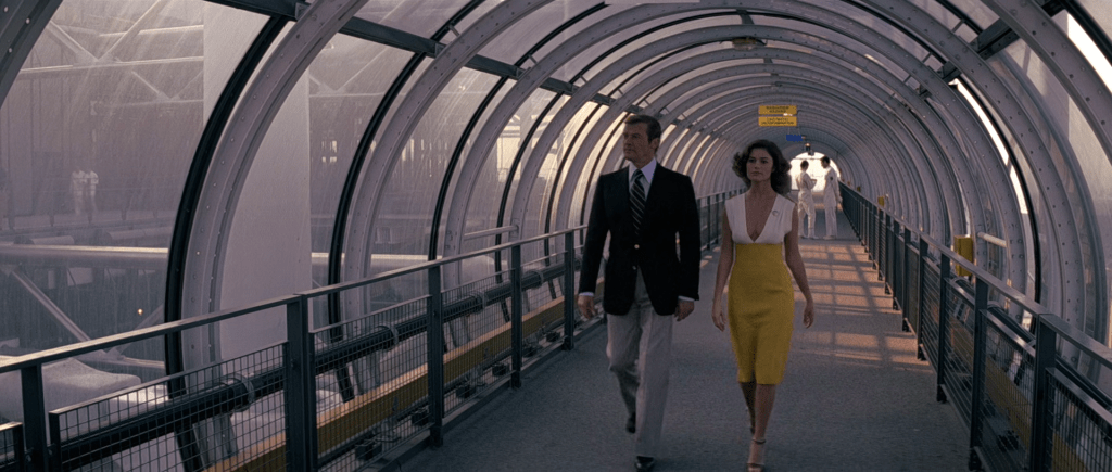 Suite a cette entrevue, la toujours très charmante Corinne Dufour accompagne Bond à pied (nous sommes donc toujours en Californie), jusqu’au laboratoire, pour y rencontrer le docteur Holly Goodhead (Lois Chiles). Ce passage a été tourné dans le Centre Pompidou à Paris – récemment inauguré en 1977 – facilement reconnaissable à ses grands tubes d’accès vitrés et ses importants portiques en métal, qui donnent au bâtiment une allure d’immense machinerie.