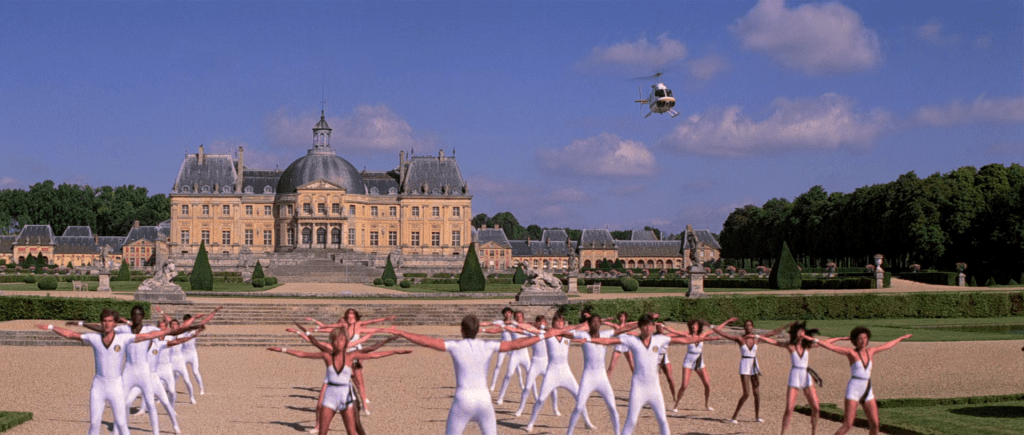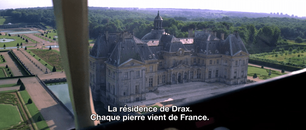 Les somptueux jardins du château de Vaux-le-Vicomte, conçus par le célèbre paysagiste André le Notre, se retrouvent – non sans humour – le lieu du terrain d’entraînement des cosmonautes de Drax.