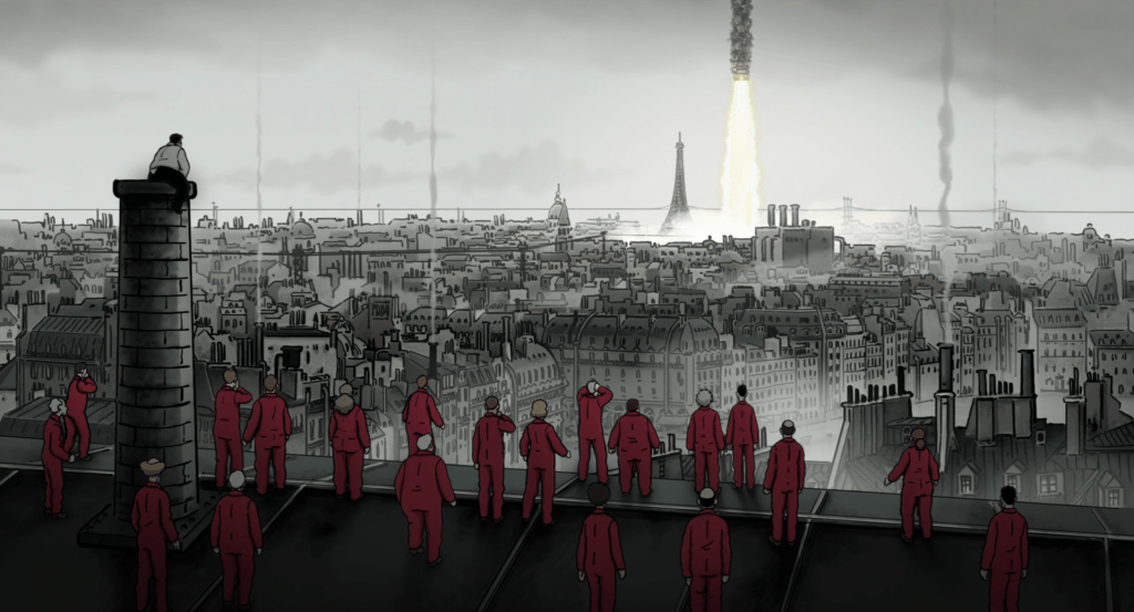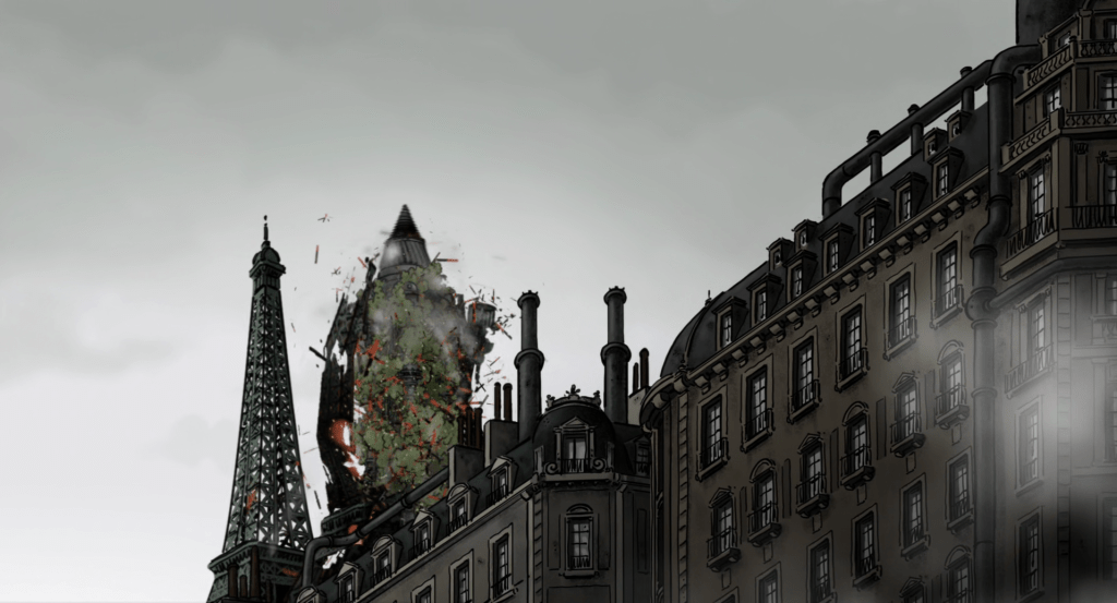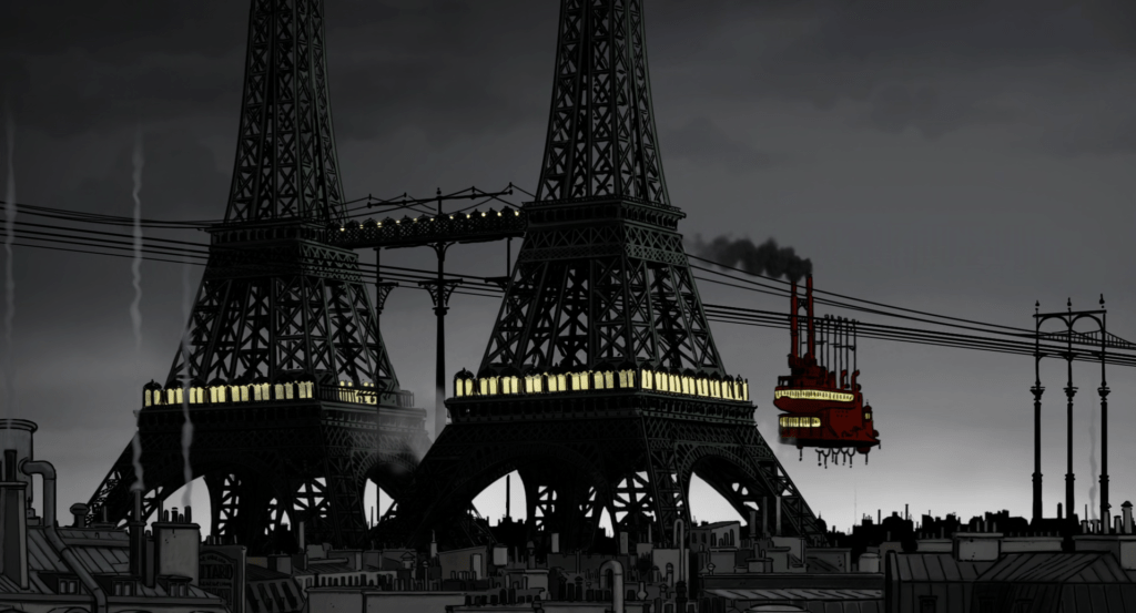 L’intrigue se déroule dans un Paris gris et morose – qui ressemble beaucoup à l’original – mais diffère par certains détails insolites : le meilleur exemple est… le dédoublement de la tour Eiffel !