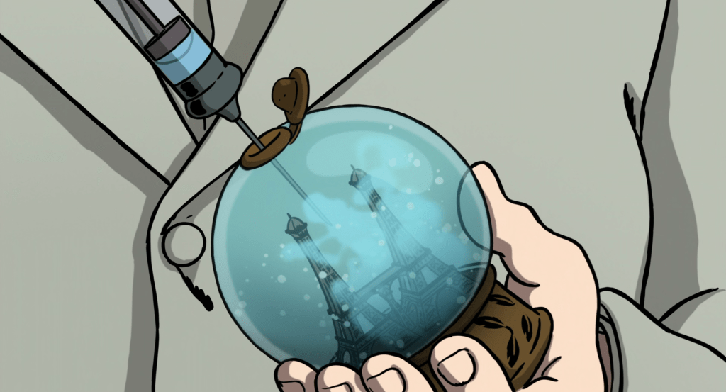 Les cinéastes Ekini et Desmares vont encore plus loin dans l’utilisation de la symbolique iconique que représente la tour Eiffel : Avril, fille de deux scientifiques clandestins poursuivis par la police, possède une boule à neige avec une mini-double-tour-Eiffel-gare à l’intérieur, qui ne la quitte jamais. Connaissant l’attachement de sa fille pour cet objet, sa mère y injecte directement le sérum qui attire toutes les convoitises de leurs adversaires. Cette boule devient alors l’enjeu central du film.