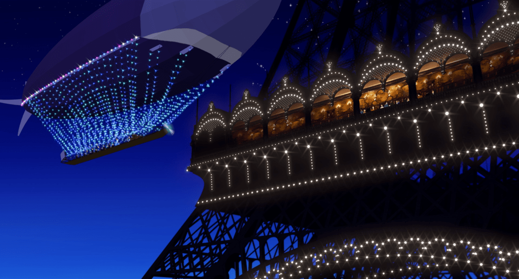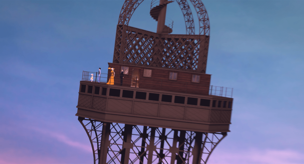 La tour Eiffel s’improvise à nouveau en gare, cette fois-ci pour dirigeables, baignée dans le chant déchirant de la diva Emma Calvé, autre amie de Dilili.