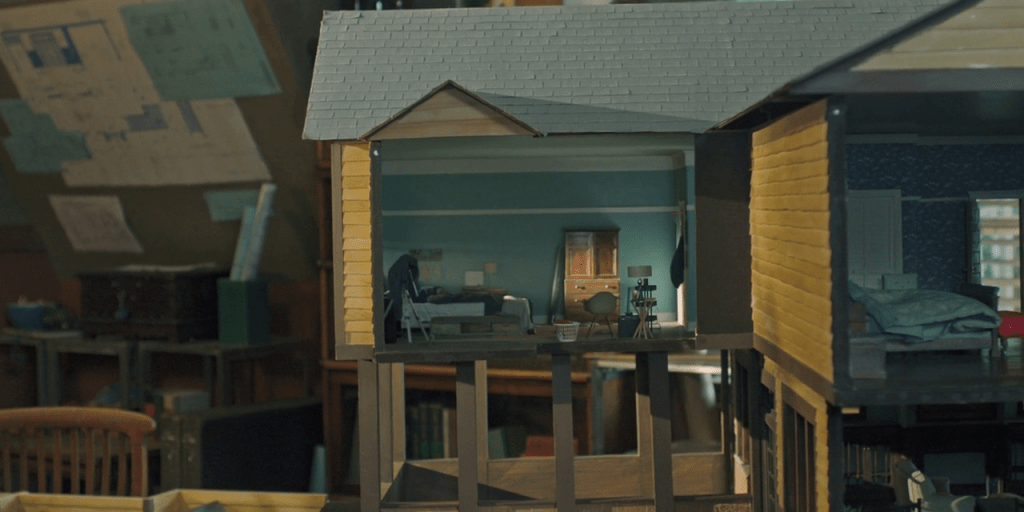 Voici l’atelier de la mère artiste qui confectionne des maisons de poupée. Plusieurs sont en cours de réalisation pendant que la caméra continue de tourner, décrivant l’établi et la table de travail, se dirigeant ensuite vers une maquette, réplique parfaite de la maison où habite la famille.