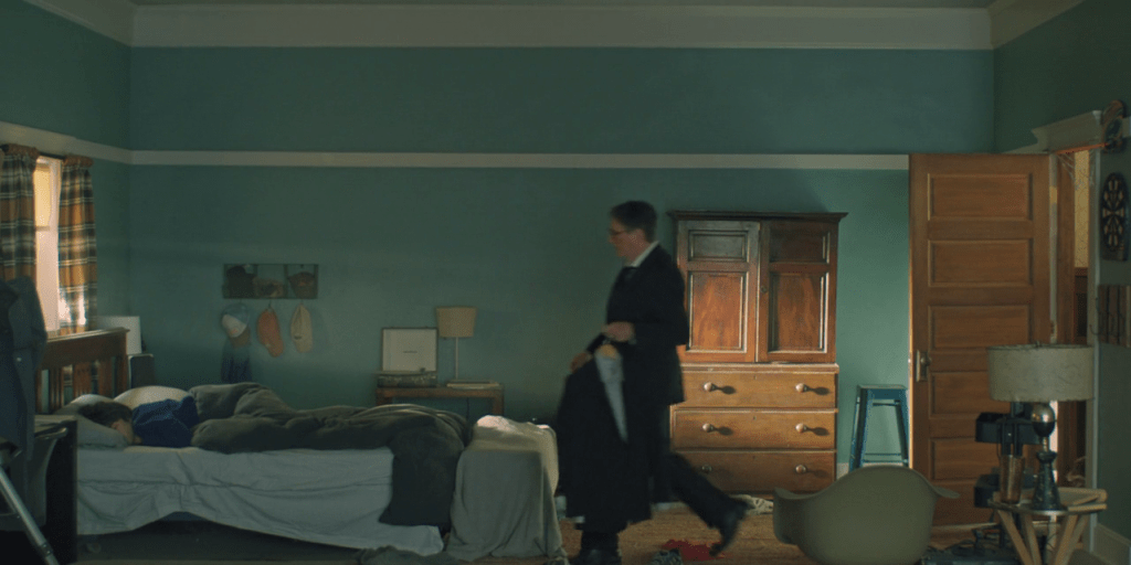 On assiste en quelque sorte à une vue de la maison dans la maison, pleine de détails, même si la maquette n’est pas encore terminée. La caméra approche de plus en plus de la chambre du fils, et …