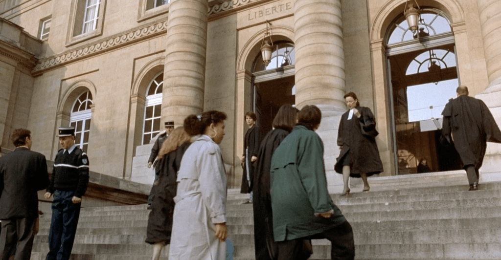 Julie retrouve au palais de justice sa rivale et cette rencontre va la faire avancer sur son chemin vers la liberté (comme indiqué sur le fronton). Ce haut lieu symbolique fait aussi le lien avec le deuxième film de la série, « Blanc ».