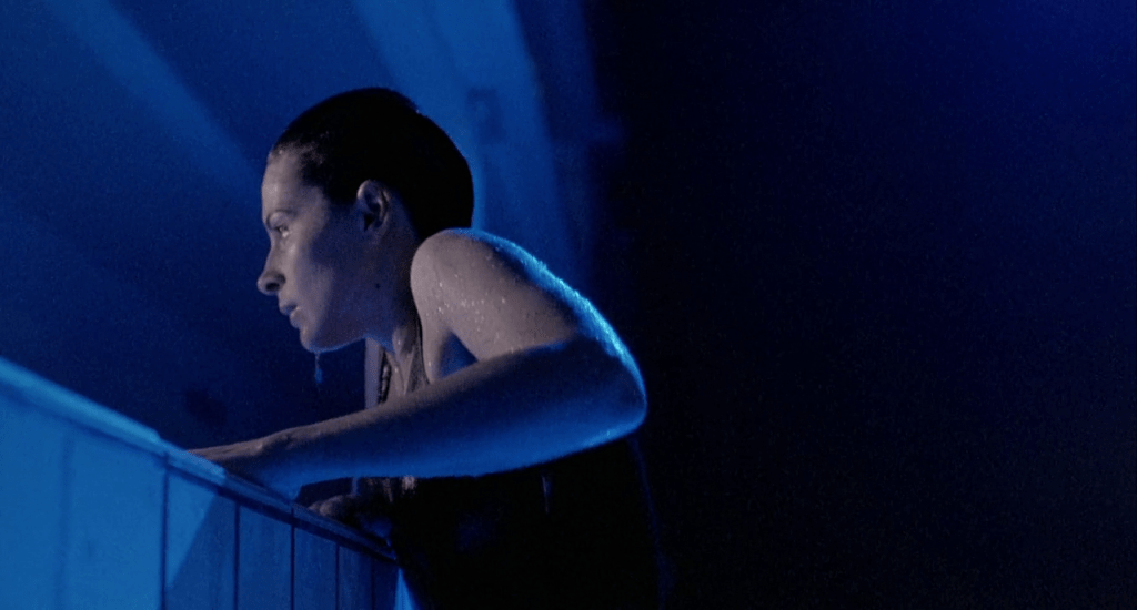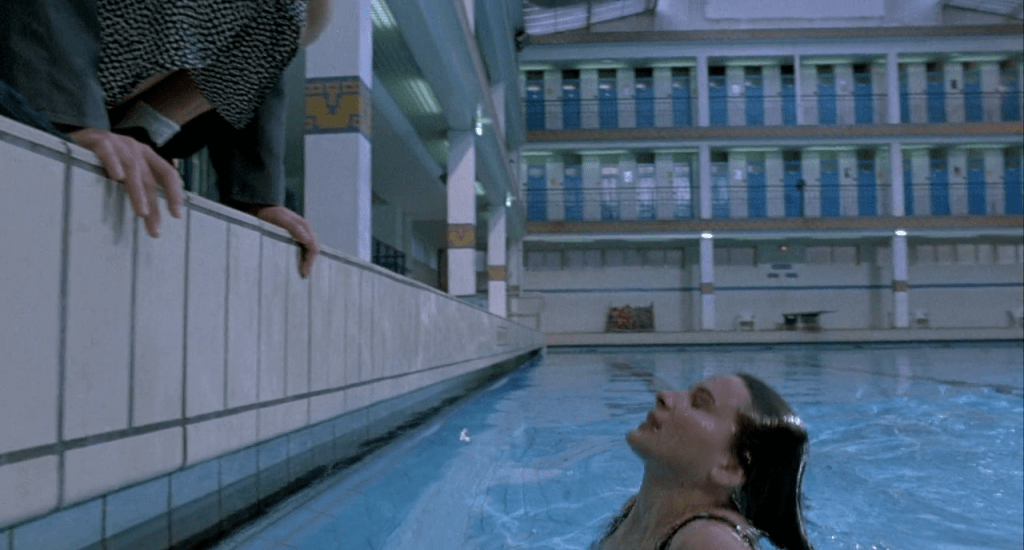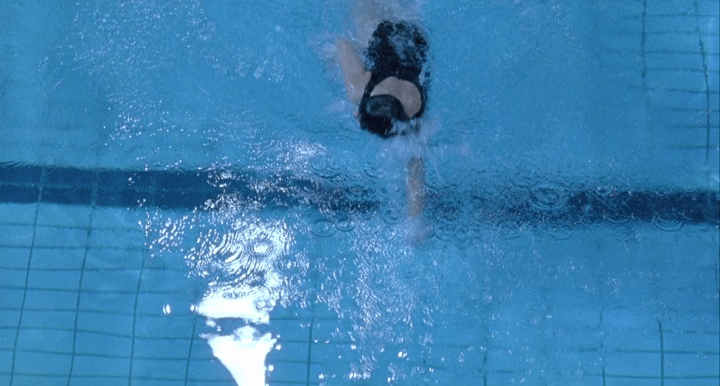 La dernière de ces séquences de nage s’achève par un mouvement de caméra très élaboré, qui va « perdre » d’abord la nageuse (et suggérer pour un bref instant la noyade), puis revenir sur elle – hommage explicite au classique du film d’horreur « La Féline » de Jacques Tourneur (voir aussi « Piscinéma »).
