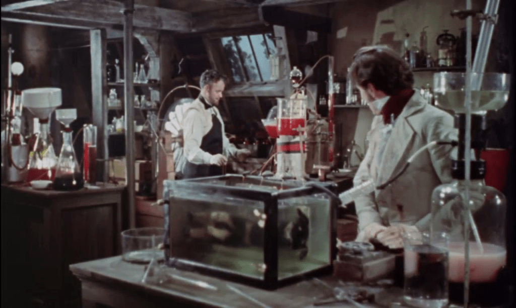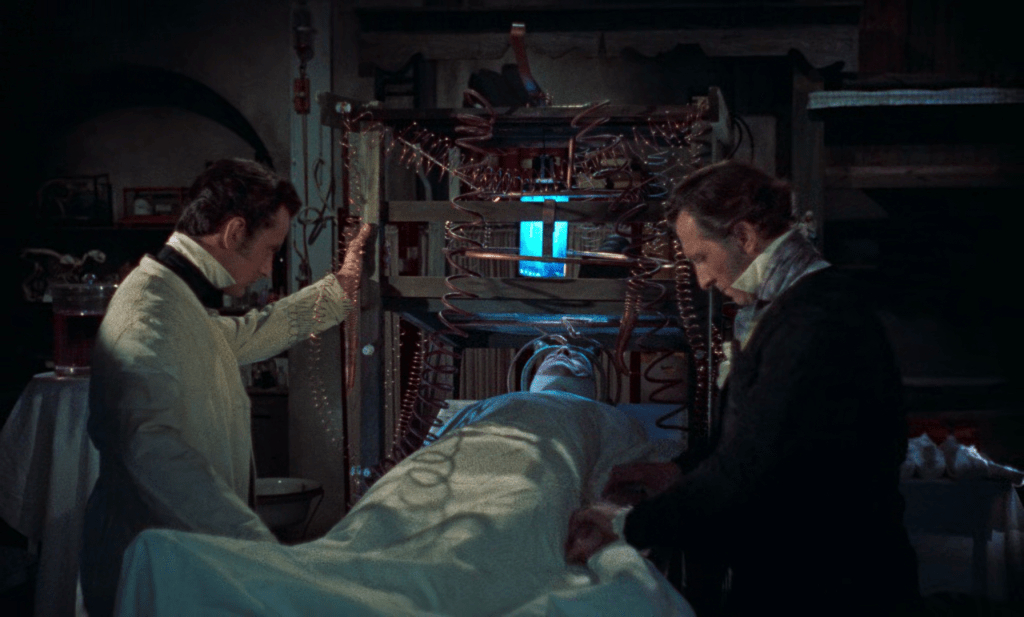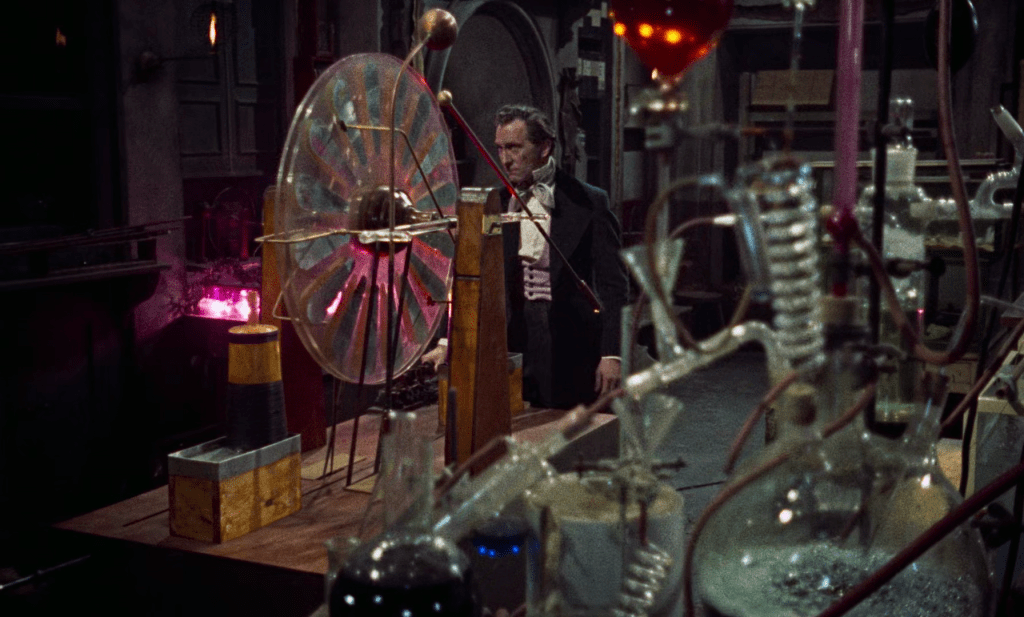 Pour la première adaptation en couleur du mythe du Dr. Frankenstein, créateur d’un Prométhée moderne et incontrôlable, le décorateur Bernard Robinson accentue naturellement dans le laboratoire, la présence de liquides verts, violets, bleus et – bien sûr – rouge sang.