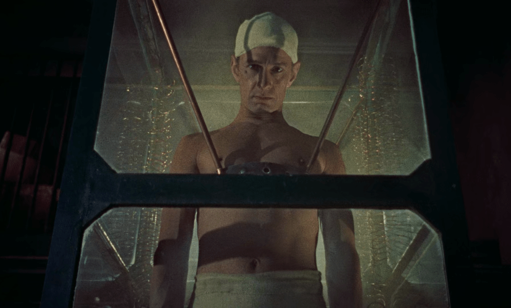 Dans la suite du film, tournée un an après par la même équipe, le cercueil vitré est posé à la verticale ce qui permet à la créature – pas encore terminée – de nous regarder de haut.