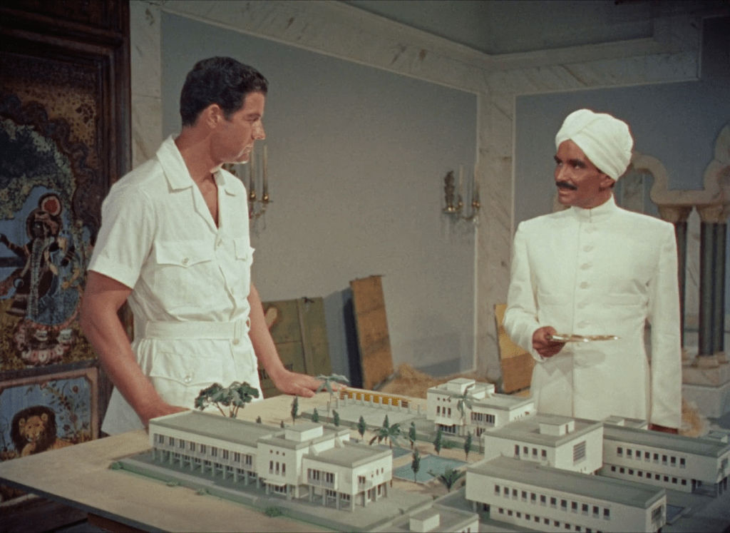 La mission de l’architecte Berger/Mercier est de construire un quartier ultramoderne avec des écoles et un grand hôpital, dans la région du Rajasthan. Un projet fonctionnel en rupture avec les traditions architecturales du pays, qui fait plus songer à la ville moderne de Chandigarh, gigantesque chantier conçu par Le Corbusier à partir de 1947 au Pendjab et inauguré en 1966 – sept ans après le tournage du « Tombeau hindou » de Lang.