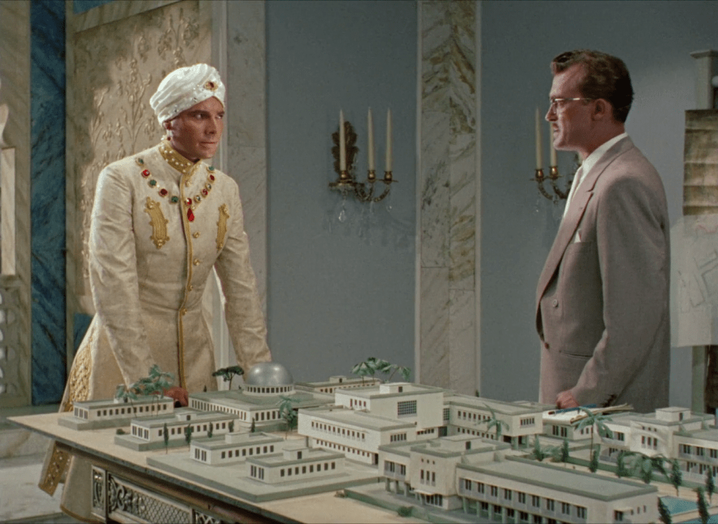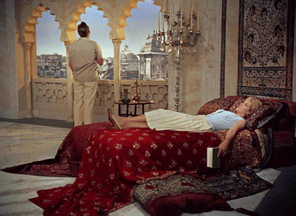 Les trois versions (1921, 1938 et 1959) utilisent avec brio les éléments d’architecture locale (colonnes, moucharabiehs, etc.) pour créer des parcours labyrinthiques, filtrer les vues et mettre à distance, afin de souligner les interdits et les envies des protagonistes, qui à l’exception du maharadja, se perdent vite dans les innombrables salles et couloirs du palais.