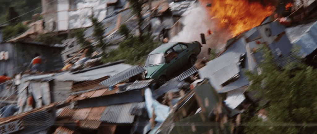 C’est ici que Chan situe la séquence d’action la plus spectaculaire de son film, où une poursuite en voiture entre gangsters et police détruit la majeure partie des taudis (spécialement construits pour le film d’après le bidonville bien réel de Tai Hom Chum, qui sera détruit en 2001).