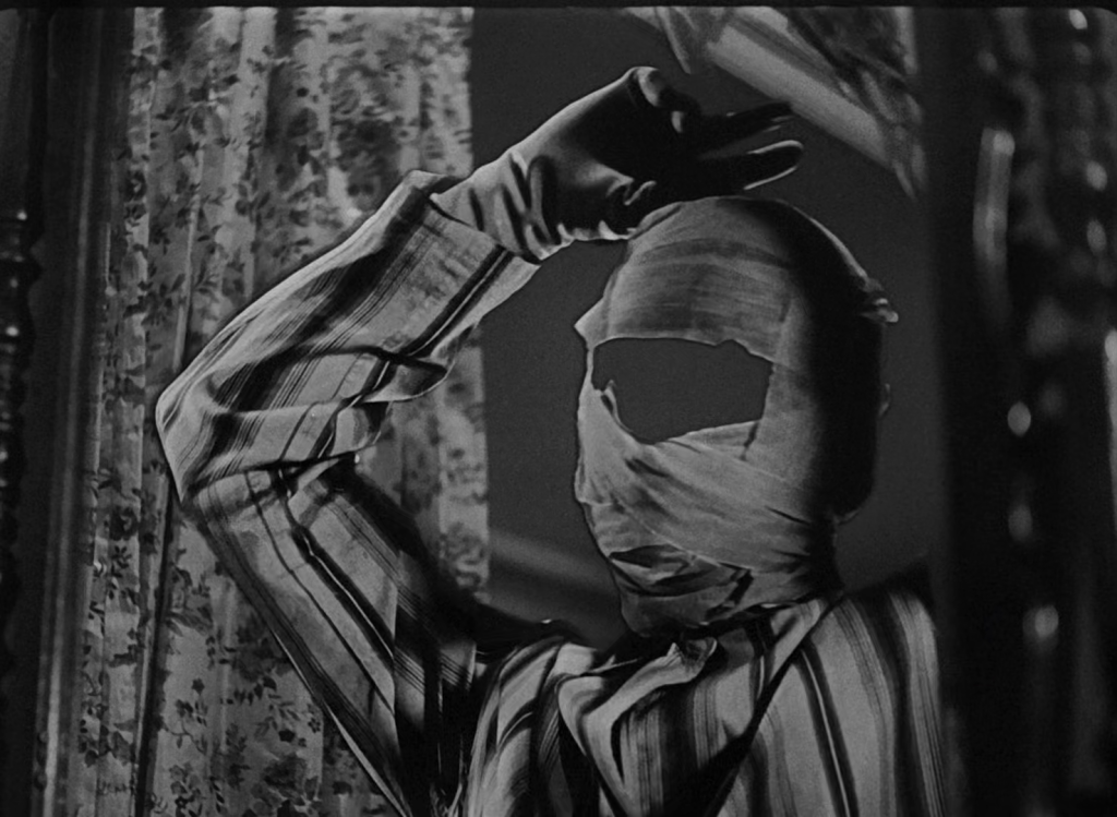Les expérimentations de L’Homme invisible d’après H. G. Wells, donne l’occasion aux cinéastes de montrer la terrifiante absence de visage de Claude Rains, à gauche dans « L’Homme invisible » de James Whale (1933), ou celui de Vincent Price, à droite dans la suite « Le Retour de l’homme invisible » de Maurice Tourneur (1940), quand ils se contemplent dans le miroir.