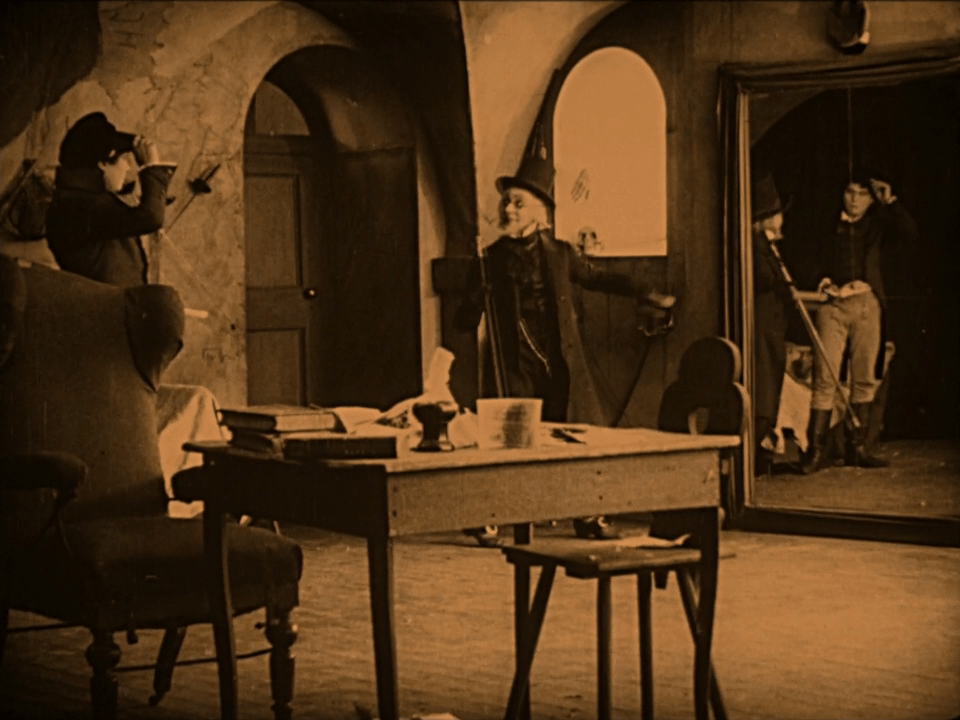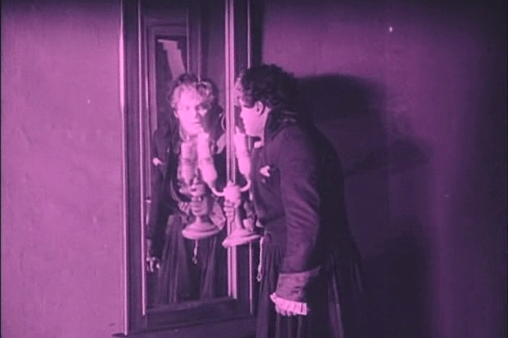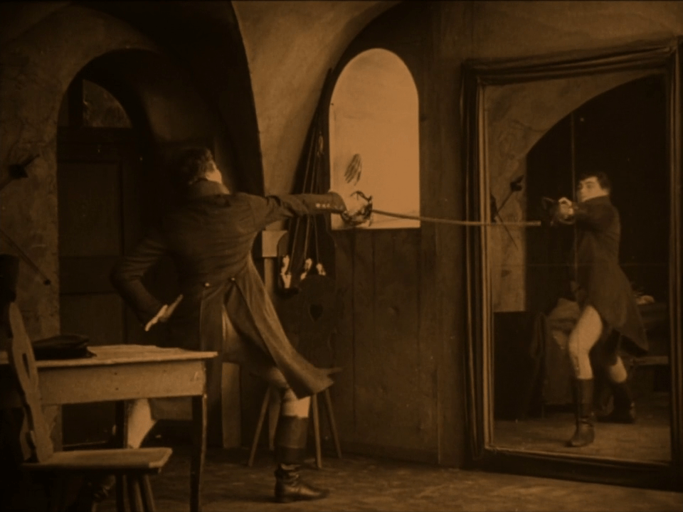 « L’Etudiant de Prague » (1913) est l’un des premiers exemples où le miroir acquiert un pouvoir fantastique, puisque le sinistre Scapinelli conclut avec Balduin (Paul Wegener), étudiant fougueux mais fauché, un acte faustien : Scapinelli a le droit de prendre ce qu’il veut dans la chambre de l’étudiant contre la coquette somme de 100 000 florins.