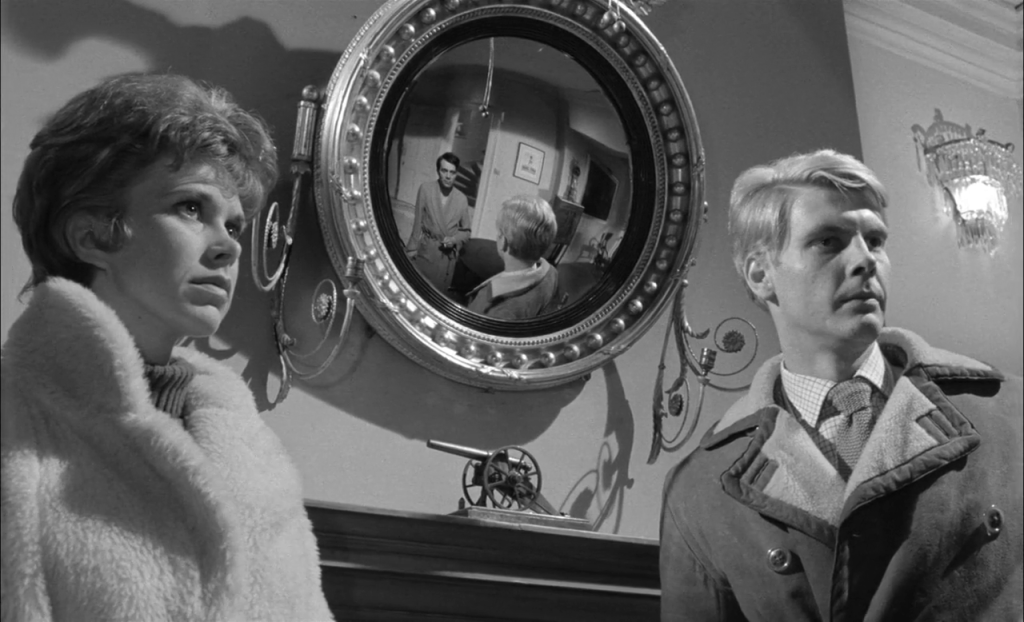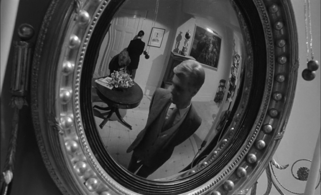 A la fois discret et omniprésent dans l’appartement du célibataire Tony (James Fox), le petit miroir convexe de « The Servant » de Jospeh Losey (1963) devient un élément important de la mise en scène.