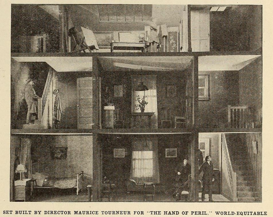 On attribue généralement à Maurice Tourneur, cinéaste français émigré aux Etats-Unis, la première utilisation en 1916 d’un décor en coupe à grande échelle (« cuttaway set »), pour « The Hand of Peril ». Si le film a aujourd’hui disparu, il subsiste des articles qui attestent de cette nouveauté et de l’ingéniosité du procédé, permettant de montrer simultanément plusieurs actions se déroulant en parallèle dans une maison, à des niveaux et endroits différents.
