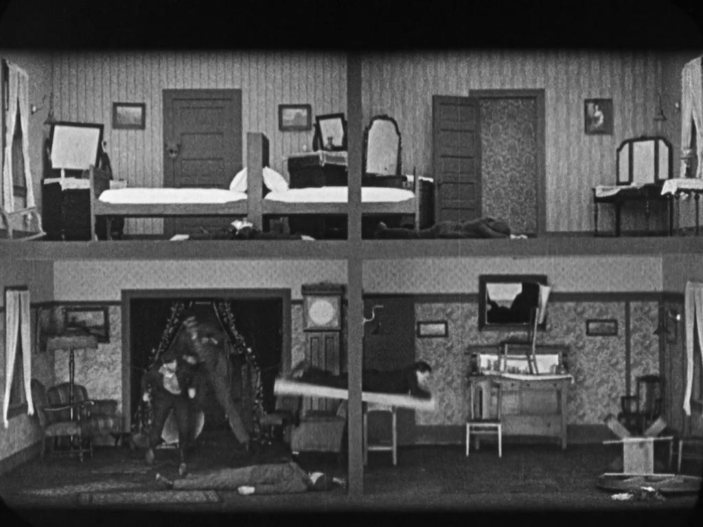 Si Keaton nous montre la maison en coupe, c’est essentiellement pour pouvoir filmer en continuité la poursuite frénétique à travers quatre pièces situées sur deux niveaux. Curieusement, la maison, qui est en fait un très grand décor, donne l’impression d’une maison de poupée minuscule – un effet assez paradoxal. Le fait de la voir en coupe nous extrait de la réalité du récit par le biais d’un point de vue impossible (dans la réalité).
