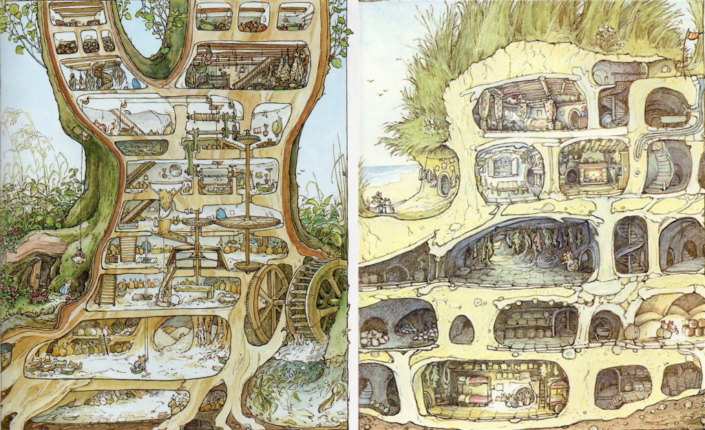 Par ailleurs, on trouve des dessins en coupe perspective assez souvent dans les livres pour enfants, comme ceux illustrés par l’anglaise Jill Barkem ou encore par le japonais Kazuo Iwamura.