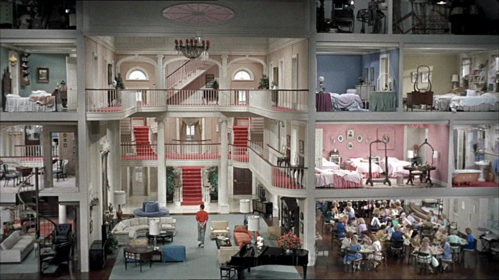 Dans « Le Tombeur de ces dames » (1961), le comique Jerry Lewis, qui a la phobie des femmes, commence un travail comme homme à tout faire dans un pensionnat qu’il pense réservé aux hommes. Arrivé de nuit la veille, il découvre la maison – en même temps que le spectateur – qui s’avère très impressionnante, avec un escalier somptueux et un immense hall central. La caméra recule encore et dévoile un décor absolument splendide et… en coupe.