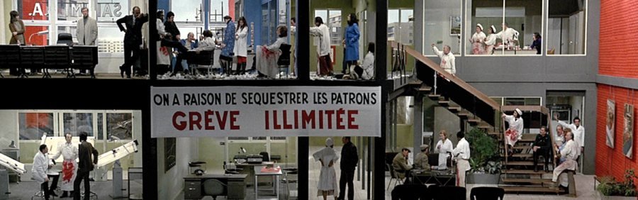 « Tout va bien » (1972) de Jean-Luc Godard, s’inspire ouvertement du « Tombeur de ces dames », avec une scène qui se déroule dans une usine en grève. Un couple de journalistes (Yves Montand et Jane Fonda) se rend dans une fabrique de charcuterie industrielle, ignorant qu’elle est occupée par ses ouvriers, et se retrouve séquestré avec le patron. Etonnamment, Godard choisit un décor en coupe perspective pour montrer ce qui se passe à l’intérieur des bureaux. La situation est préoccupante et il a un message à faire passer ; cependant le cinéaste la détourne par l’image de manière plutôt ludique et fait même appel au registre de la comédie musicale, remplaçant les chansons d’amour par des chants militants. Le métarécit fonctionne ici vraiment bien par la mise en abyme d’un procédé cinématographique inattendu et détourné !