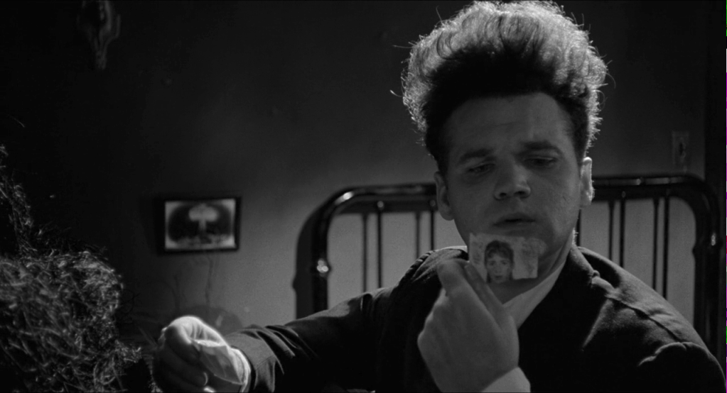 Parmi les quelques éléments de décoration insolites de la chambre, outre un tas de terre surmonté d’une branche morte arrangé sur la table de nuit et d’un tourne-disque, on aperçoit accroché au mur l’image encadrée d’une explosion nucléaire.