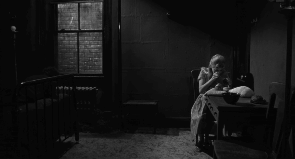 L’unique fenêtre de la chambre d’Henry n’a pas de vue, puisqu’elle donne directement sur un mur aveugle en brique, ce qui renforce l’enferment de son hôte, qui doit partager la chambre avec sa copine Mary et un étrange bébé monstrueux. L’irruption du duo dans le refuge d’Henry ajoute à l’hostilité ambiante d’un environnement urbain profondément inhumain. Par ses rêveries, Henry s’échappe d’une réalité trop lourde à supporter.