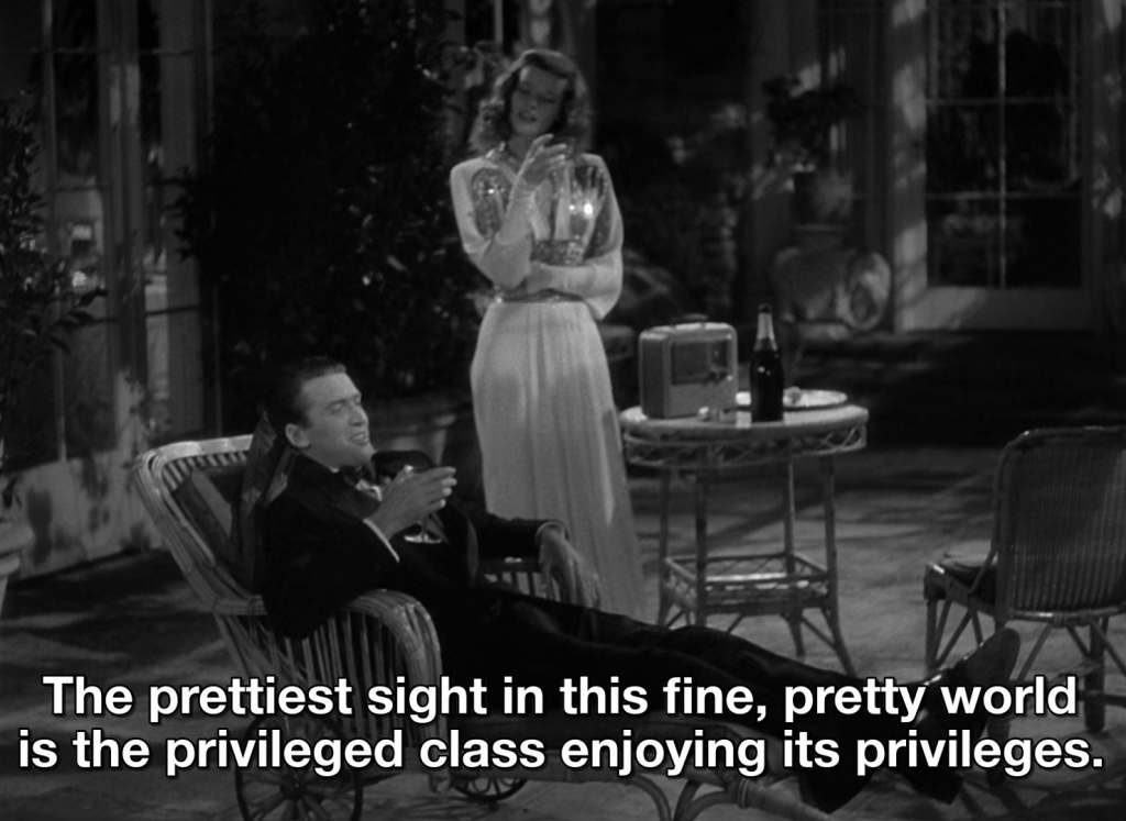 David Lynch, qui a refusé tout au long de sa carrière de donner des explications ou significations de ses films, arguant que chacun doit en tirer sa propre conclusion, a néanmoins appelé « Eraserhead » « La véritable histoire de Philadelphie » 2, en résonance avec une comédie de remariage de 1940 : « The Philadelphia Story » / « Indiscrétions » de George Cukor (ci-dessus), située dans la haute société de Philadelphie et qui est, malgré un sujet similaire (le dysfonctionnement d’un couple), aux antipodes en tout point de vue d’« Eraserhead ».