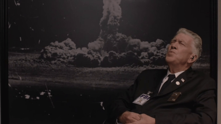 Une image qu’on retrouve dans « Twin Peaks : The Return » (2017) au mur du bureau du directeur adjoint du FBI, Gordon Cole, joué par David Lynch lui-même. Si dans « Eraserhead », l’image a été interprétée comme symbole de l’éclatement du mythe de la famille nucléaire, promu par les américains dans les années 50 et 60, la première explosion atomique (le 16.07.1945) devient dans l’épisode 8 de « Twin Peaks-The Return », le centre du récit comme déclencheur du drame à venir. La lecture très personnelle de l’histoire de l’Amérique par Lynch, qui combine fiction et réalité, opère à nouveau.