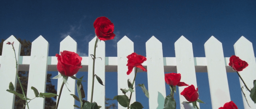 Suite au générique projeté sur un rideau bleu profond qui ondule paisiblement, la première image de « Blue Velvet » montre un ciel bleu, des clôtures de bois blanches et des roses rouges. Détail d’un lotissement typiquement rockwellien1 , où les petits écoliers traversent sagement la rue en respectant les passages cloutés.