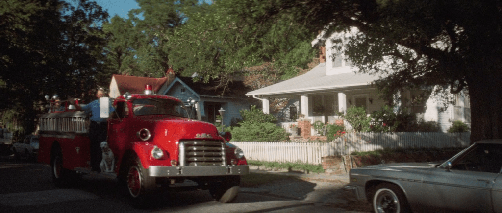 Un camion de pompier s’avance doucement avec un sapeur qui salue au passage. Lynch crée une ambiance2 légèrement décalée, presque kitsch3, dans sa présentation de la ville fictive de Lumberton, à travers un mélange de vues banales et stylisées, tournées au ralenti. Un monde un peu trop parfait, qui devient par ce fait irréel et même un peu inquiétant.