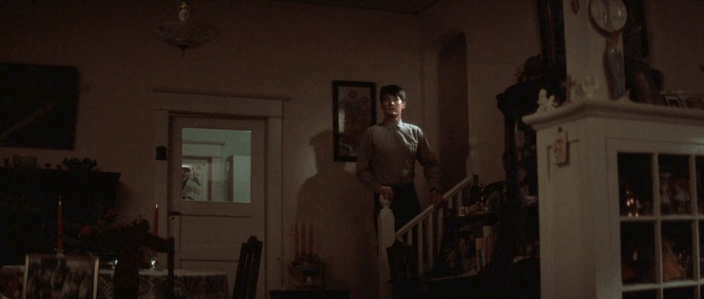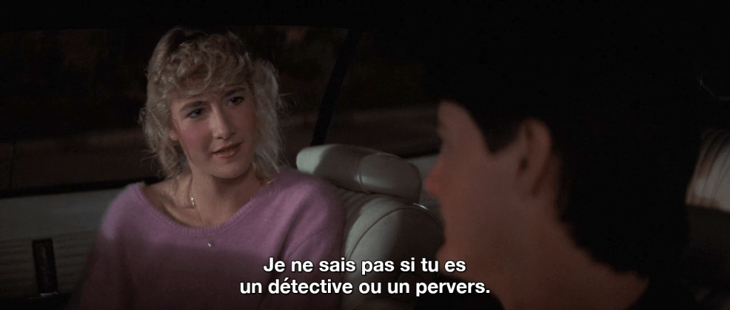 Quand Jeffrey quitte la maison, Lynch établit une analogie très claire entre l’image sur le grand écran et celle que sa mère regarde à la télé dans le salon : le détective amateur descend un escalier pendant qu’un personnage en gravit un autre sur le petit écran. Le point de vue, l’image en noir et blanc et la musique d’accompagnement laissent supposer qu’il s’agit d’un film noir.