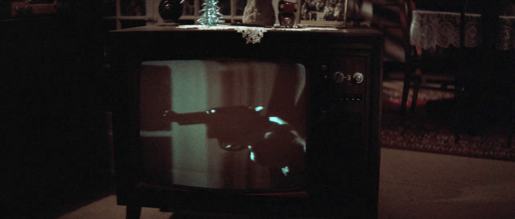Dans une autre scène, l’écran de télé est totalement occupé par un revolver. L’importance du poste de télévision au sein des lotissements a été démontrée par Lynn Spigel4 dans plusieurs articles : deux éléments qui se sont développés de manière exponentielle après la Second Guerre mondiale aux Etats -Unis (et ensuite en Europe).