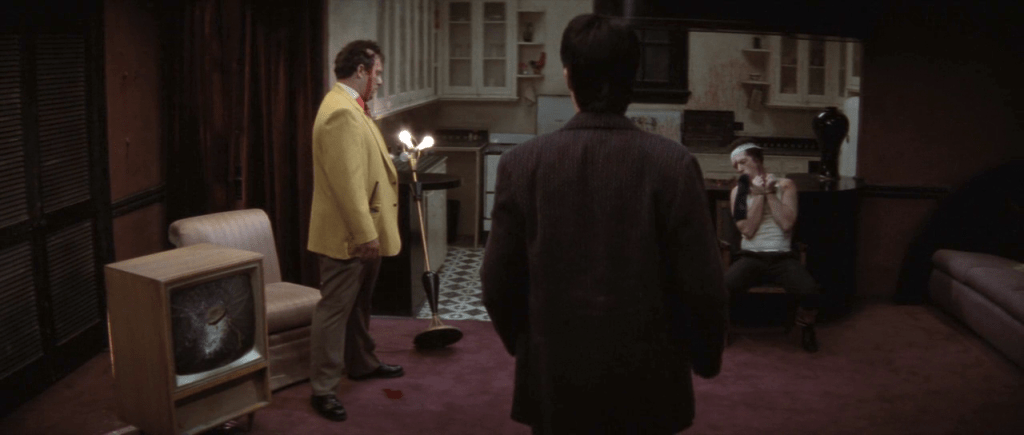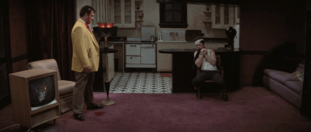 A la troisième (et dernière) visite de l’appartement de Dorothy, Jeffrey se trouve nez-à-nez avec une véritable composition à la Francis Bacon, puisque deux personnages grotesques à la chair torturée complètent l’ameublement : le mari de Dorothy ligoté et ensanglanté repose avachi et sans vie sur une chaise ; debout immobile, un policier en civil – le mystérieux homme en jaune – une blessure béante à la tête, se vide de son sang. Il est mort mais il ne le sait pas encore.