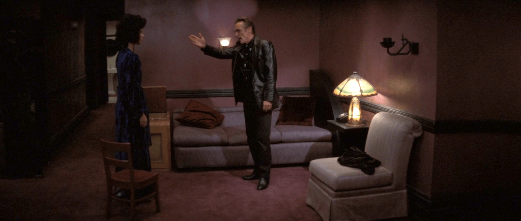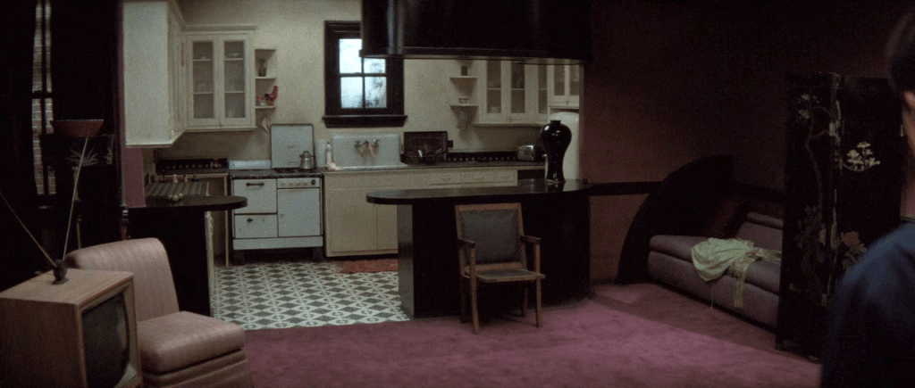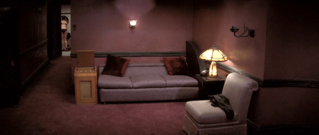 De nuit, à la recherche d’indices, Jeffrey s’introduit dans le logement vide de la chanteuse. L’intérieur de l’appartement a été construit dans les studios Carolco à Wilmington. Comme tous les intérieurs chez Lynch, celui de Dorothy Vallens dégage une étrangeté inquiétante, avec des textures palpables qu’on retrouve également dans le cinéma de la même époque de David Cronenberg et des frères Coen (notamment dans « Videodrome » et « Barton Fink »). Un mur courbé aspire les visiteurs du vestibule vers le salon de couleur pourpre avec ses fauteuils massifs et ses lampes art déco.