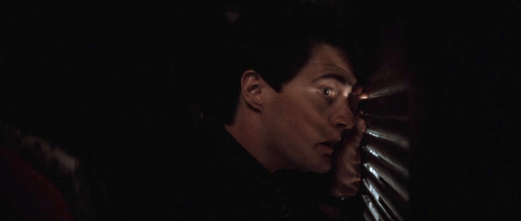 Quand Dorothy s’éloigne vers la salle de bains au fond du couloir, la caméra de Lynch reste à distance et renforce ainsi l’impression d’un plateau de théâtre. Le spectateur au cinéma et Jeffrey dans son placard ne font plus qu’un.