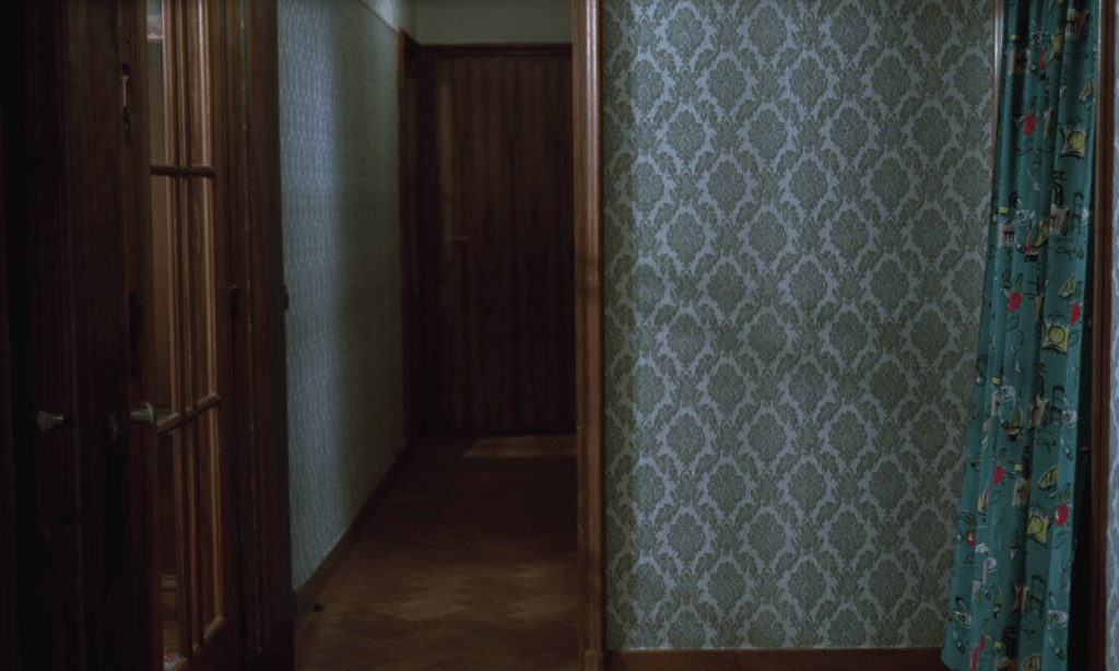 L’étrangeté du lieu provient aussi de la configuration spatiale de l’appartement qui joue un rôle significatif dans la narration. Les pièces à vivre sont spacieuses, la cuisine est ouverte sur le salon, offrant des vues dégagées. En revanche, les pièces privées, intimes, sont isolées au fond du logement, séparées du reste de l’appartement par un long couloir.
