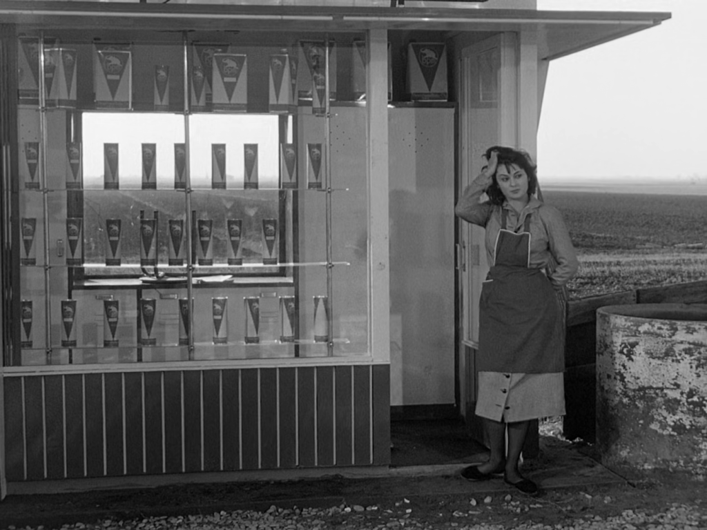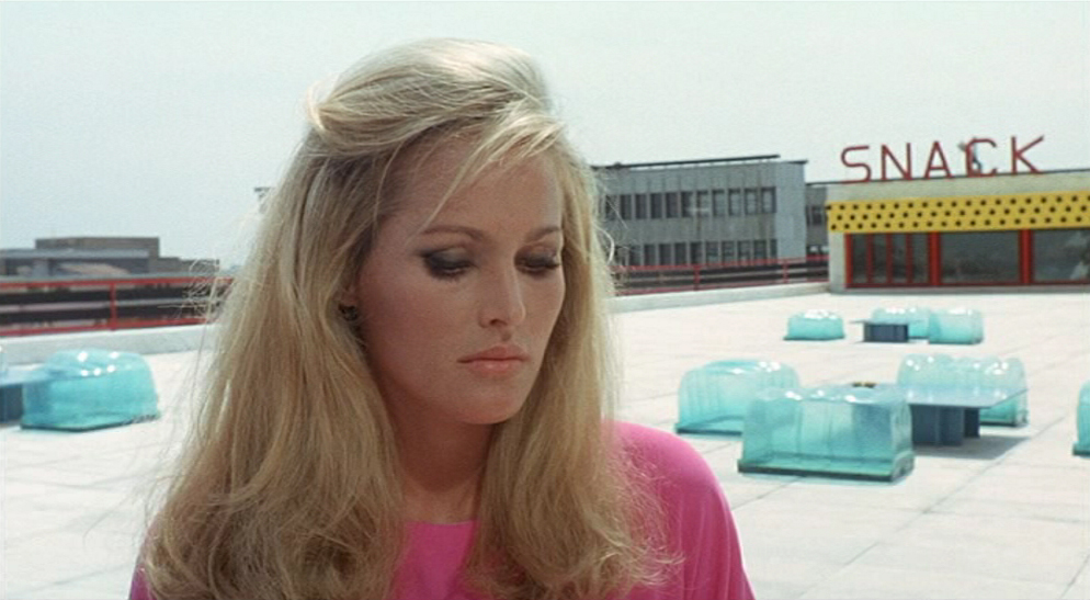 Tandis qu’Ursula Andress sirote un cocktail sur le toit du palais des congrès à Rome, construit par Alberto Liberia en 1933… l’un des deux pavillons apparaît transformé à l’occasion de la Grande Chasse (épreuve de survie à laquelle participe l’héroïne), en snack-bar aux couleurs criardes.