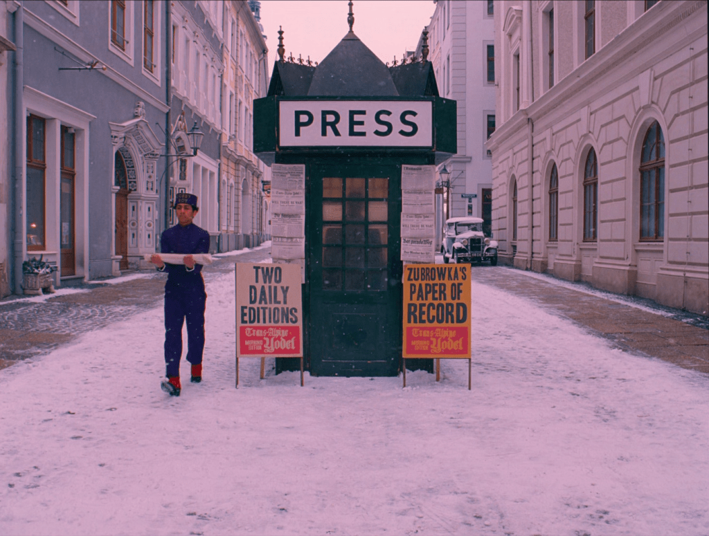 Le groom du Grand Budapest Hôtel apporte les dernières nouvelles du monde grâce au petit kiosque à journaux aux façades tapissées de gros titres et de la presse du jour.