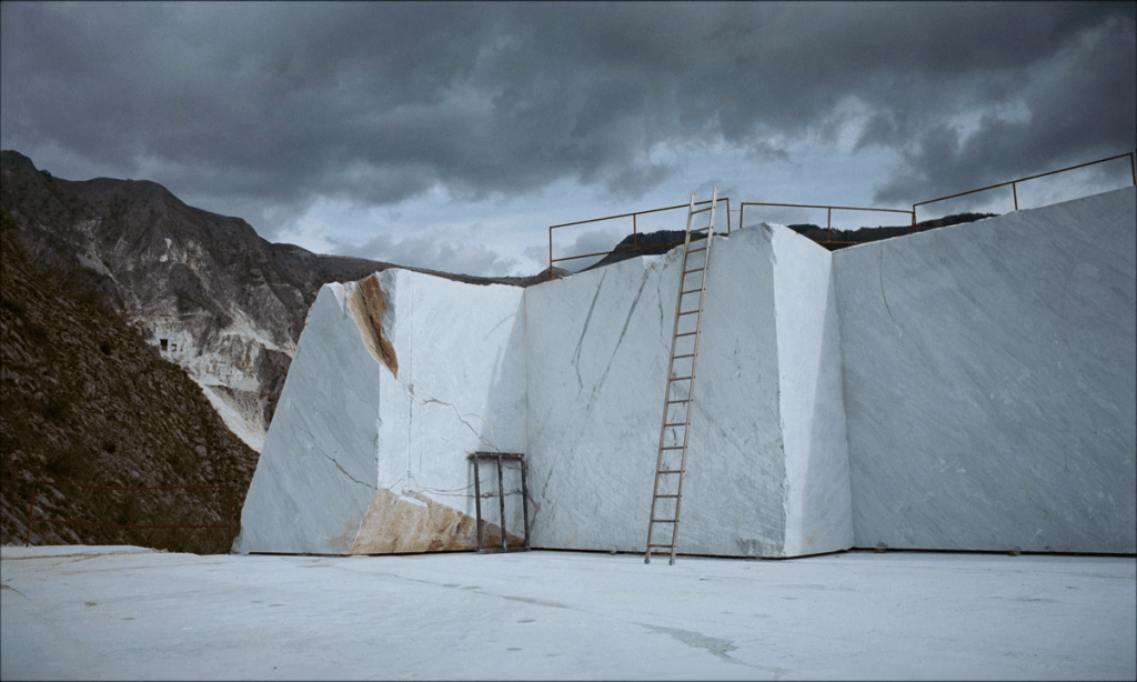 Corbet capte la majestuosité du site sous des cieux menaçants, transpercés par le soleil faisant ressortir la blancheur et le veinage du marbre.