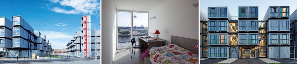Un autre exemple au Havre, la Cité A Docks, créé ainsi une résidence étudiante avec ces blocs longitudinaux assemblé par l’architecte Séverine Cattani. Les portes des pignons sont remplacées par de grands vitres qui diffusent la lumière, avec des conteneurs empilés sur quatre niveaux reliés par des coursives extérieures.