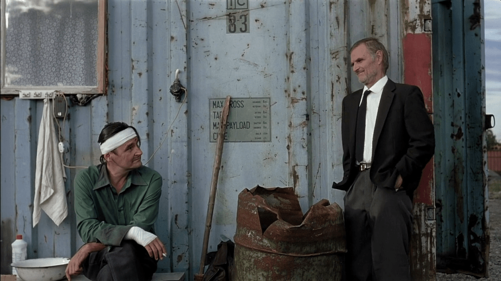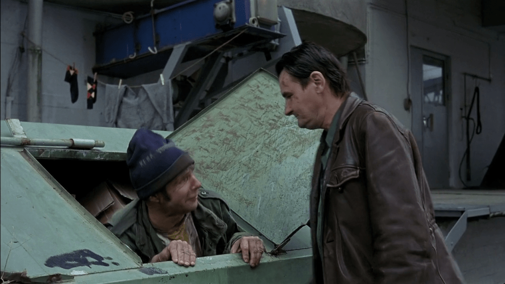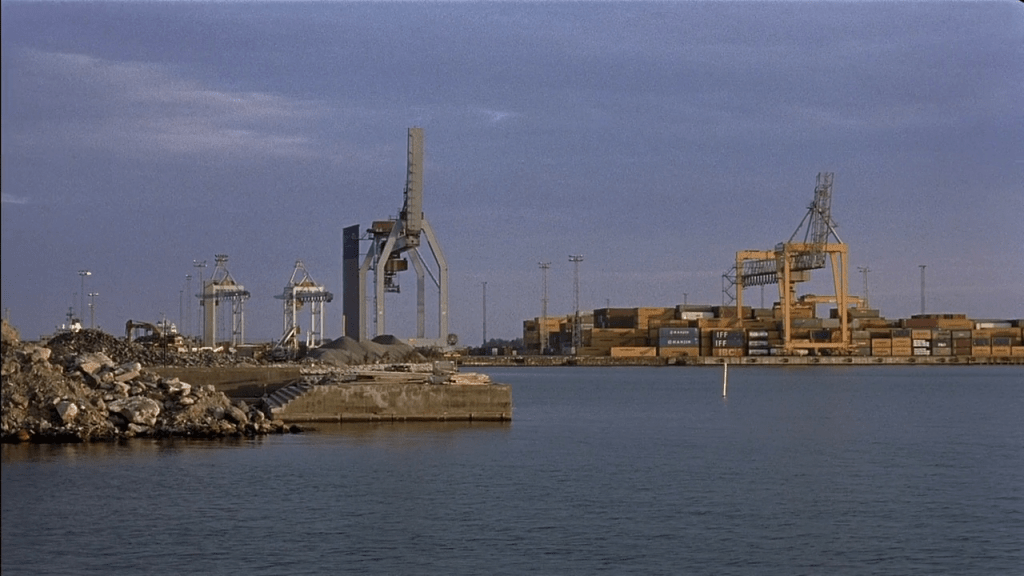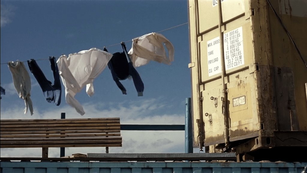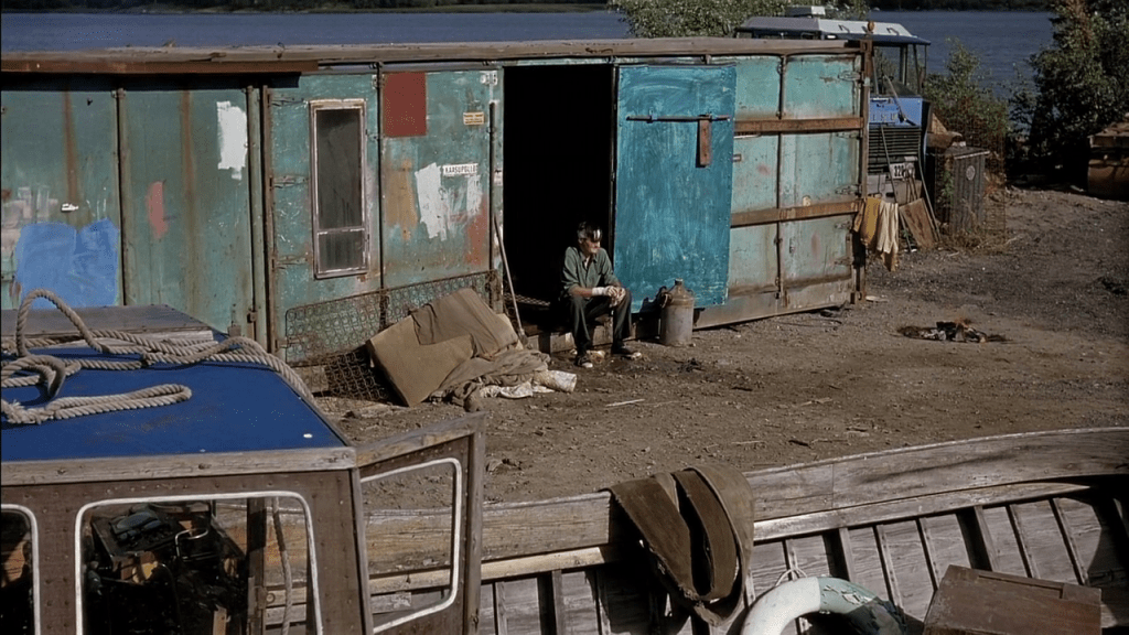 Cette superposition d’une réalité concrète (des boîtes métalliques décolorées, peu isolées et avec des fenêtres bricolées, utilisées comme abris au milieu des détritus du port) et d’un regard poétique (un mobilier à la fois branché et récupéré — comme l’inévitable juke-box présent dans quasiment tous les films du Finlandais) crée une atmosphère unique.