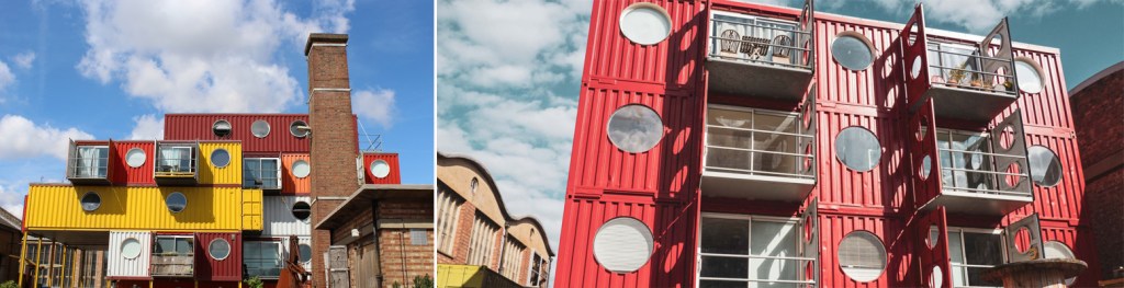 Les architectes se sont également emparé des conteneurs pour les transformer en logements — individuels ou même collectifs (ci-dessus un exemple de 2001 dans les docks de Londres, en Angleterre à Trinity Buoy Wharf). L’idée est de réemployer une structure solide et durable à coût réduit, pour une construction rapide qui laisse la possibilité d’une certaine mobilité (grâce à la possibilité de déplacer les unités de blocs rectangulaires).
