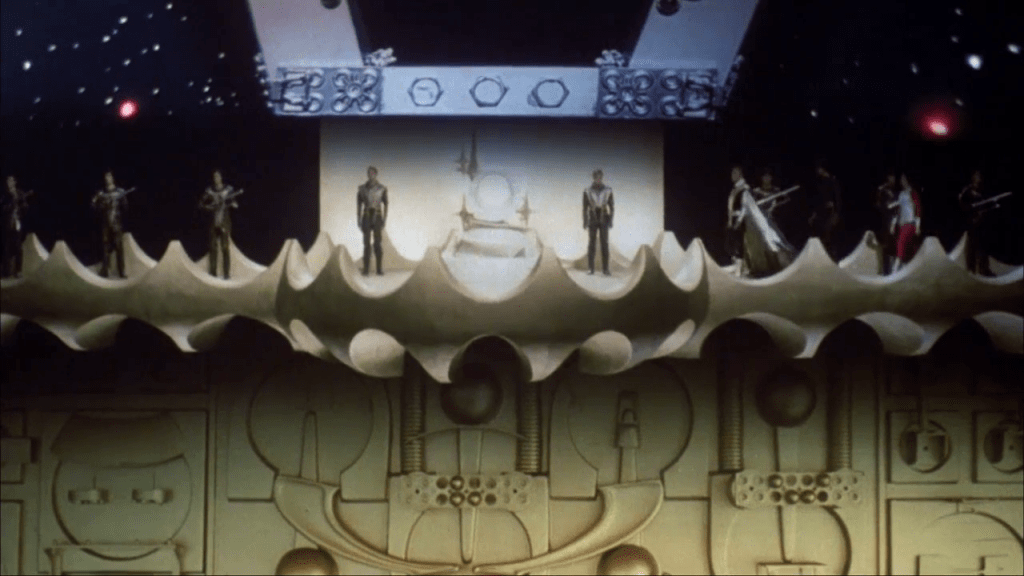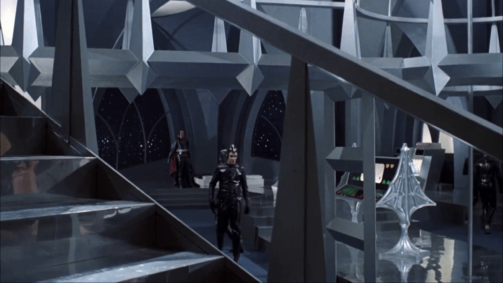 D’autres décors, comme celui de la séquence de condamnation de l’intrépide Stella Star et de son vaillant copilote Akton, semblent s’inspirer de la découverte du monolithe sur la Lune dans 2001, l’Odyssée de l’espace de Stanley Kubrick (!).