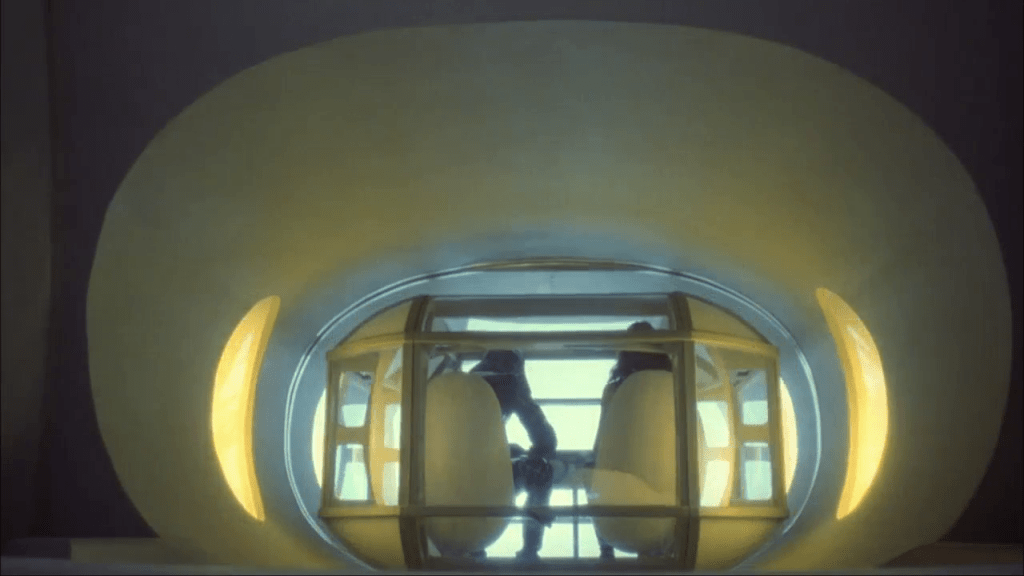 Capturée par des amazones à la solde du comte Zarth Arn, Stella Star se retrouve face à une étrange méridienne doublée d’un poste de télévision – autre hommage éhonté à Luigi Colani. Détail curieux : celui qui est installé sur le divan ne peut pas voir l’image de l’écran au-dessus. Dommage que le film n’explique pas son fonctionnement !