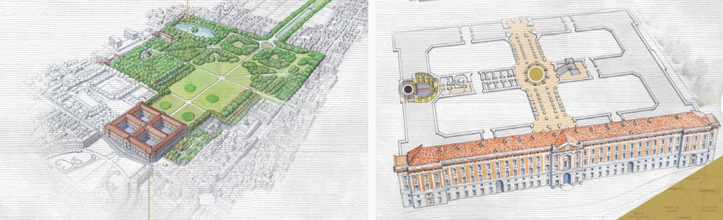 La construction de ce vaste complexe de 1 200 pièces réparties sur cinq niveaux est l’œuvre de l’architecte baroque napolitain Luigi Vanvitelli. Les travaux, commencés en 1752, s’étalèrent sur plus de trente ans — ralentis par des épidémies de choléra et une famine — et ne s’achevèrent qu’en 1789.