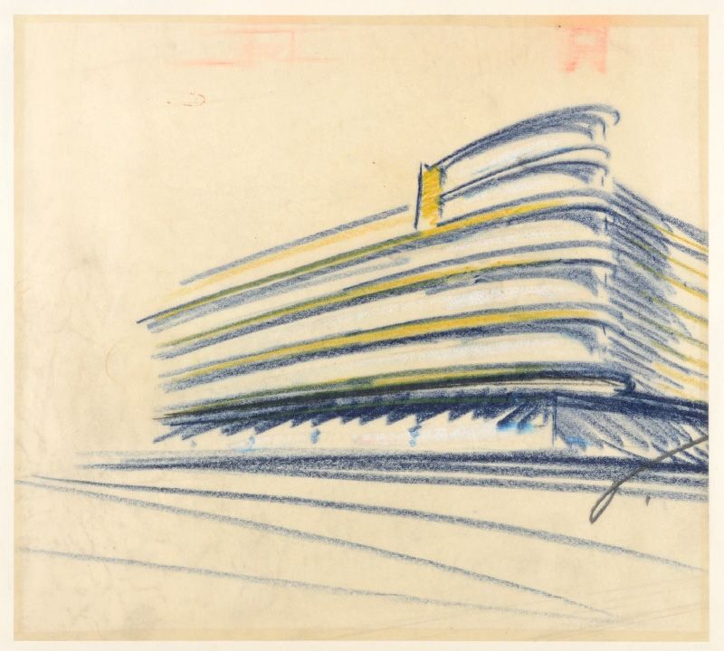 Cette vue constitue un hommage manifeste aux croquis de l’architecte expressionniste allemand Erich Mendelsohn (1887-1953).