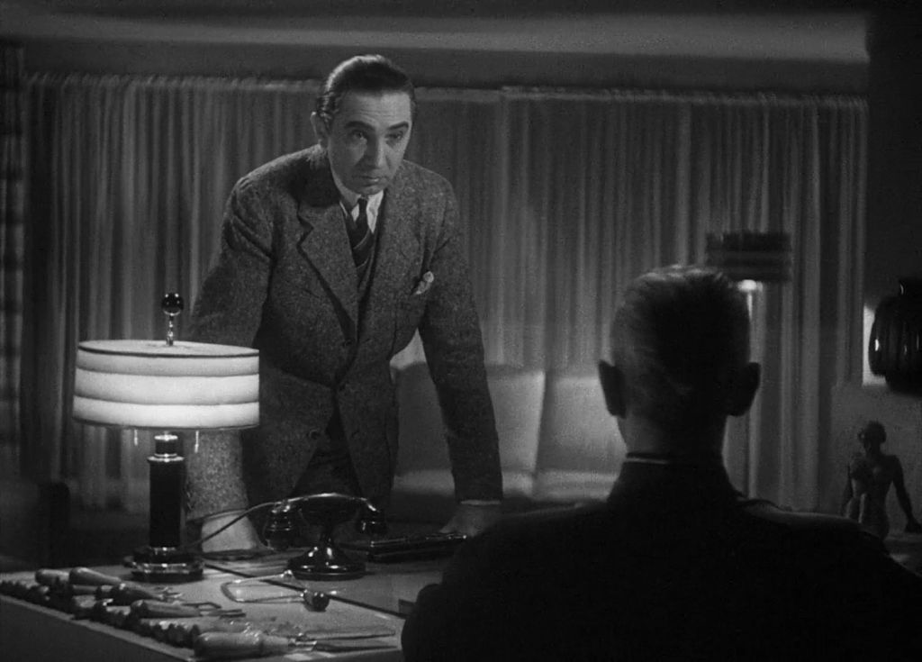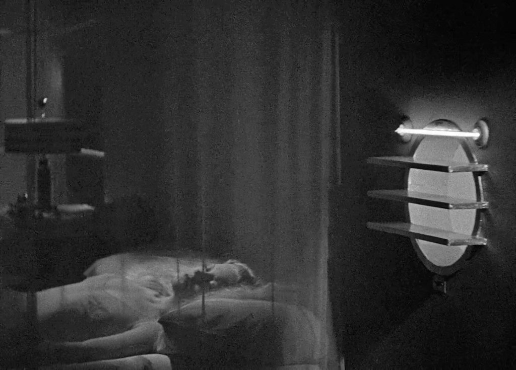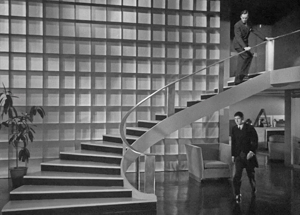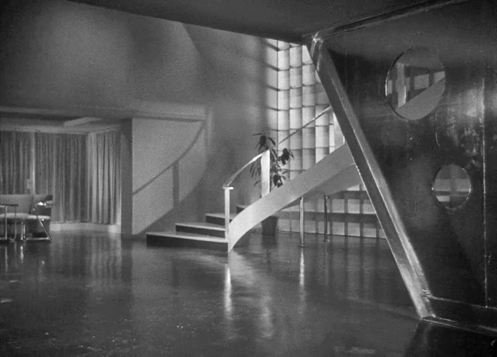 Grand admirateur de l’architecture expressionniste allemande et du Bauhaus, Ulmer puise dans ce répertoire pour concevoir l’intérieur de la demeure, qu’il détourne intelligemment : derrière un modernisme propret et froid se dissimulent des zones d’ombre inquiétantes et sordides.