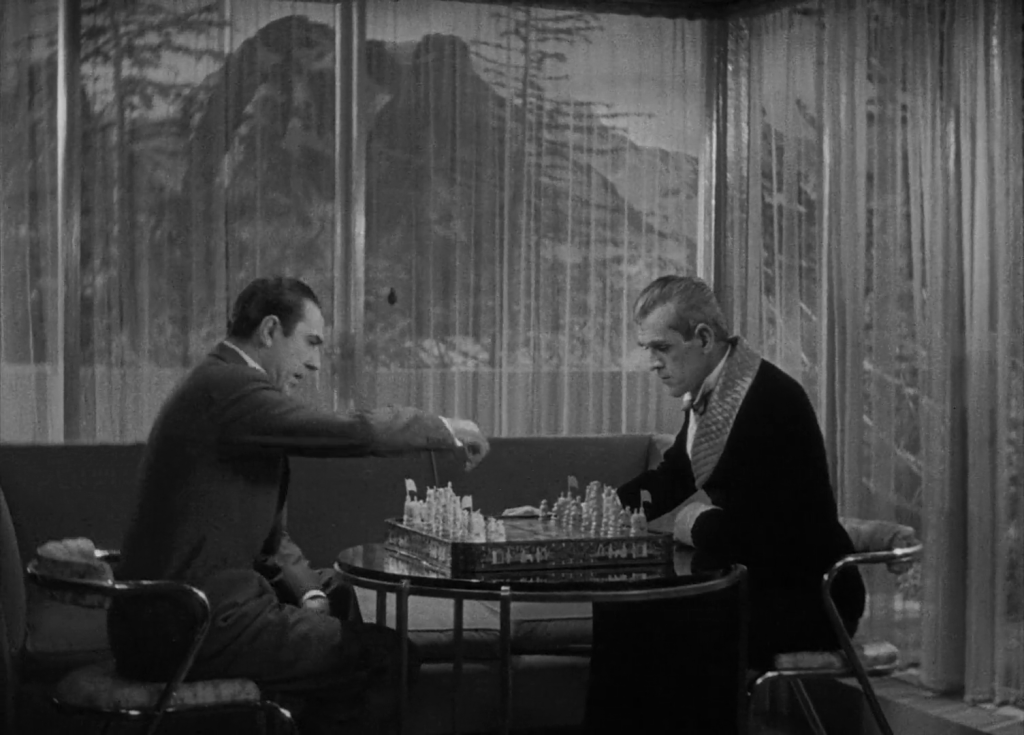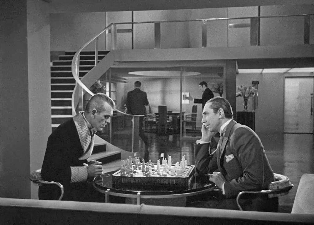 Lorsque le cinéaste Edgar G. Ulmer se voit confier la réalisation du Chat noir pour les studios Universal, il doit composer non seulement avec un budget minuscule, mais aussi avec un délai de tournage réduit à seulement dix-neuf jours. Ulmer adopte alors un parti pris esthétique audacieux : au lieu de reprendre les décors gothiques (le château de Dracula) ou expressionnistes (le laboratoire de Frankenstein) typiques des productions Universal, Le Chat noir se déroule dans une villa ultramoderne, lumineuse, tout en verre et en métal – un décor qu’on retrouve dans les années 30 plus souvent dans des comédies musicales mondaines.