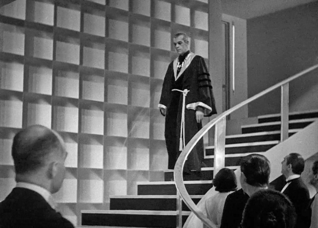 Le décor devient la fameuse « machine à habiter » chère à Le Corbusier, ici détournée en un haut lieu du contrôle et de la mort : un espace calculé, symétrique, presque inhumain — une extension du personnage de Hjalmar Poelzig lui-même. Une forteresse de glace où la modernité se transforme en menace.