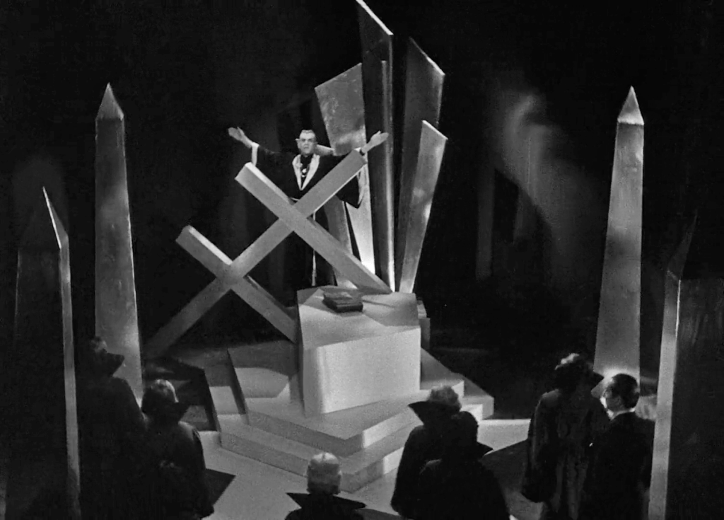 La scène d’occultisme est, quant à elle, fortement influencée par le discours de la fausse Maria dans les catacombes de Metropolis (1927) de Fritz Lang. On y retrouve les mêmes compositions géométriques et hiératiques, les jeux de lumière violents et une architecture monumentale qui écrase l’humain.