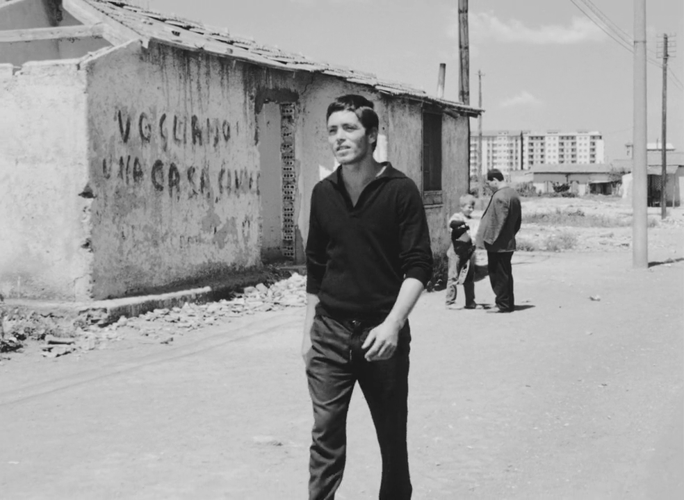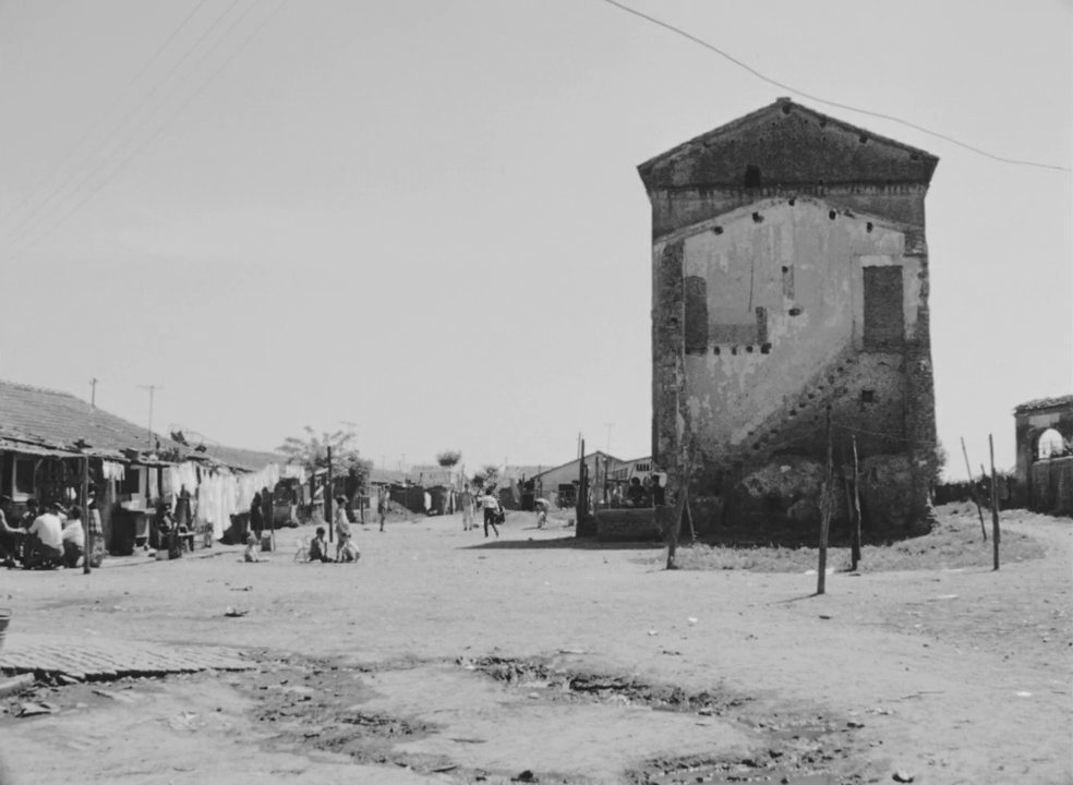 Accattone passe avec son ami Balilla (Mario Cipriani) devant la ruine d’une maison où l’on peut lire un graffiti : « Vogliamo una casa civile » / « Nous voulons un logement digne ».